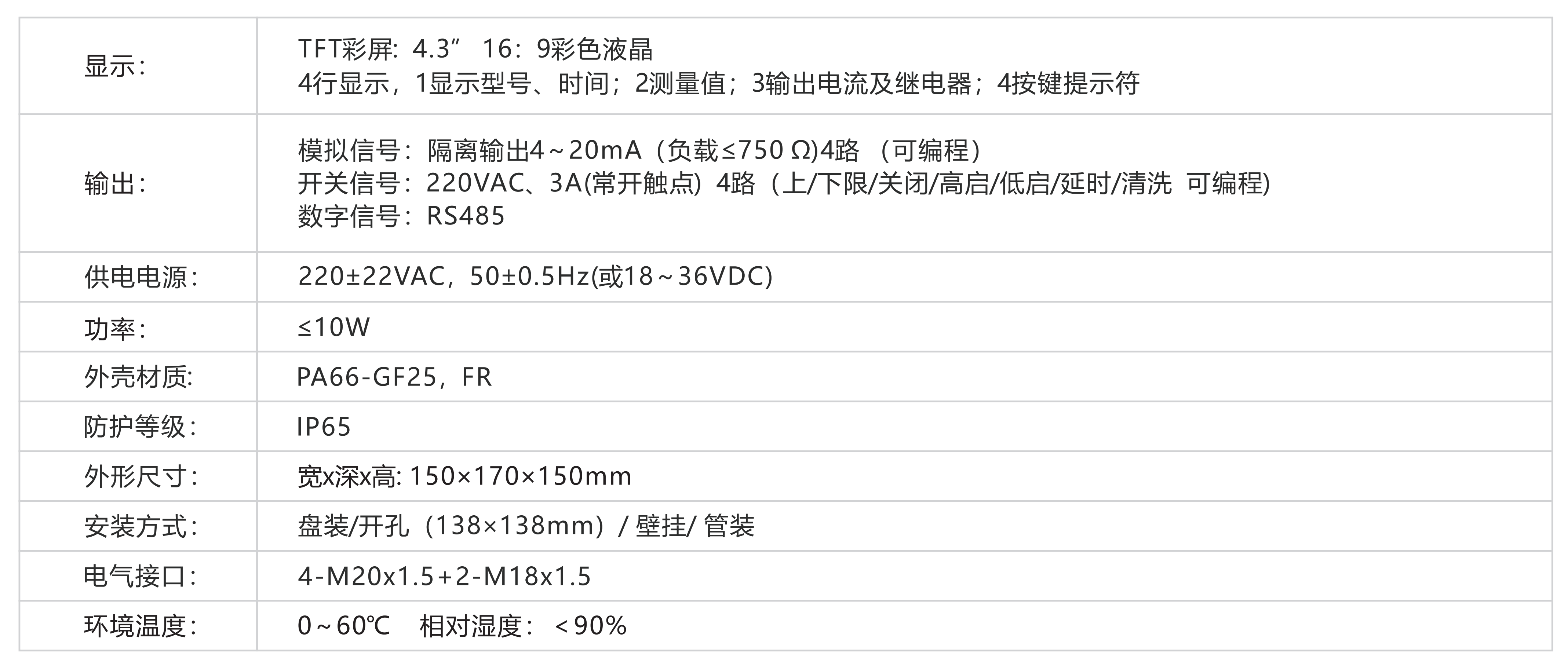 可編程繼電器輸出:繼電器報警值/回差控制/清洗控制等可編程