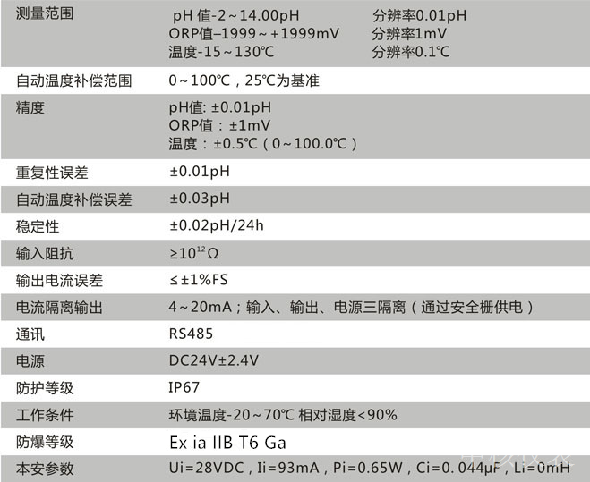 變送器采用二線制,24VDC供電,布線簡單。可輸出4-20mA、RS485、4-20mA+ RS485等多種信號供給顯示、記錄、控制、調節等儀表或PLC、DCS、FCS系統。符合GB3836.1-2010《爆炸性氣體環境用電氣設備 第1部分:通用要求》和GB3836.4-2010《爆炸性氣體環境用電氣設備 第4部分:本質安全型“i” 》標準;防爆標志為ExiaIICT6 Ga,它適用于0區、1區、2區,含有IIA~IIB類,T1~T4組爆炸性氣體混合物的場所;經國家防爆電氣產品質檢中心檢驗合格,取得防爆合格證。