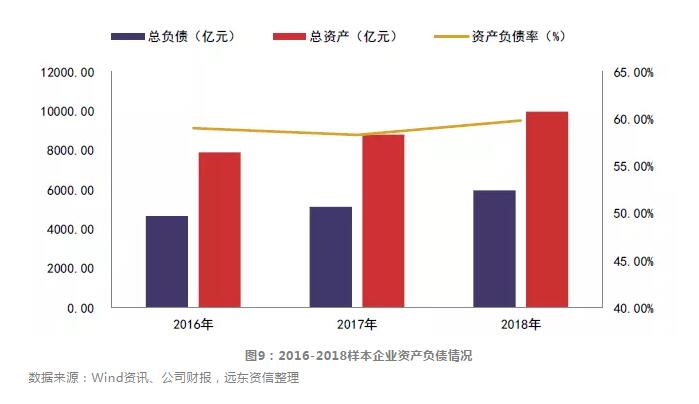 從資產情況來看,我國水務企業資產規模穩步擴大,2018年底,樣本企業總資產合計為9973.64億元,較上年末增長13.31%。從資產構成來看,對于部分地方性水務資產運營平臺,其供排水資產計入固定資產,因此固定資產和在建工程為其主要資產, 2017年末和2018年末,樣本企業固定資產和在建工程在總資產中的合計占比分別為35.61%35.23%,占比基本穩定。此外,由于目前大量水務項目均以特許經營方式運營,無形資產也是水務企業資產的重要組成部分,2017年末和2018年末,樣本企業無形資產總額分別為867.16億元和902.19億元,占資產總額的比重分別為9.85%10.45%,占比略有提升。