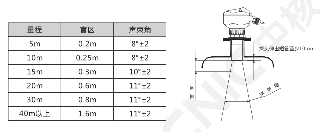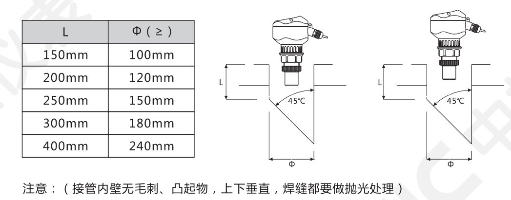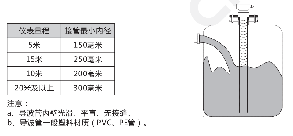 6、導波管:深井等聲束角內有障礙物、或者液面波動大的場合,可以將傳感器安裝到導波管內或者旁通管內;