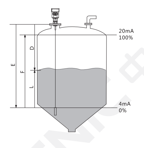 通過輸入空罐高度E(=零點(diǎn)),滿罐高度F(=滿量程)及一些應(yīng)用參數(shù)來設(shè)定,應(yīng)用參數(shù)將自動(dòng)使儀表適應(yīng)測(cè)量環(huán)境,對(duì)應(yīng)于4~20mA輸出。