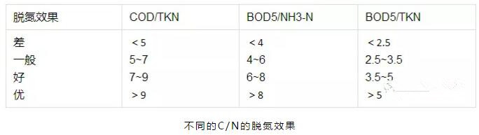 在脫氮過程中,C/N將影響活性污泥中硝化菌所占的比例。因為硝化菌為自養(yǎng)型微生物,代謝過程不需要有機(jī)質(zhì),所以污水中的BOD5/TKN越小,即BOD5的濃度越低硝化菌所占的比例越大,硝化反應(yīng)越容易進(jìn)行。硝化反應(yīng)的一般要求是BOD5/TKN>5,COD/TKN>8,下表是GradyC.P.L.Jr推薦的不同的C/N對脫氮的效果的影響