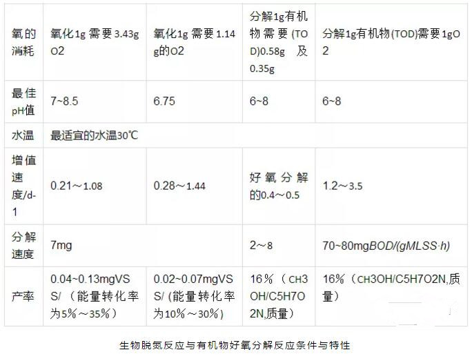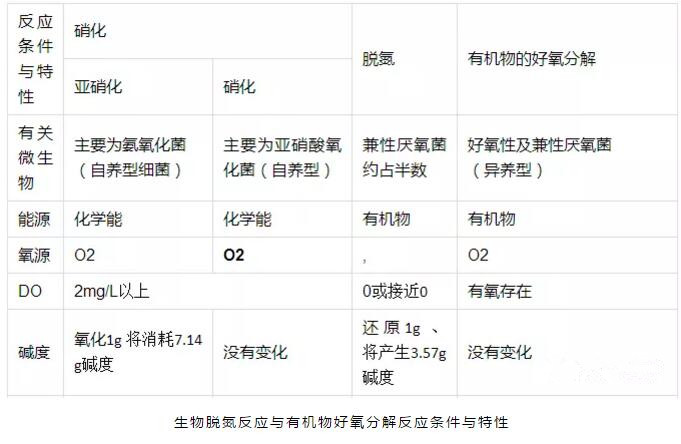 生物脫氮過程包括氨氧化、亞硝化、硝化及反硝化,有機(jī)物降解碳化過程亦伴隨著這些過程同時完成。綜合考慮各項因素(如菌種及其增值速度、溶解氧、pH值、溫度、負(fù)荷等)可有效減化和改善生物脫氮的總體過程。生物脫氮反應(yīng)與有機(jī)物好氧分解反應(yīng)條件與特性。