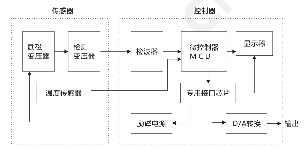 CN162是電磁感應(yīng)式電導(dǎo)儀,由MCU在軟件控制下產(chǎn)生的交流電壓驅(qū)動浸沒在被測溶液中的勵磁變壓器,在被測溶液中產(chǎn)生感生電流,該感生電流又在檢測變壓器中產(chǎn)生一個很大的交變感生電勢,該感生電勢與被測溶液的電導(dǎo)率成正比。將這個感生電勢檢波后由MCU采樣,同時溫度傳感器也將溶液溫度信號送至MCU采樣和依照內(nèi)存的該溶液的特性曲線,進行高精度的(每0.5℃校正一次)溫度補償運算和非線性校正運算。計算后得到的濃度數(shù)值通過顯示器就地顯示出來,同時經(jīng)D/A轉(zhuǎn)換電路變成標(biāo)準(zhǔn)電流信號遠(yuǎn)傳輸出。