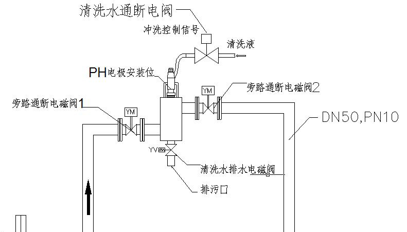 3.清洗過程結束,通過控制電路開啟旁路通斷電磁閥1和2,關閉清洗水通斷電磁閥和清洗水排水電磁閥,此時介質正常從旁通管內流通回到主工藝管路,繼續介質的PH在線測量;