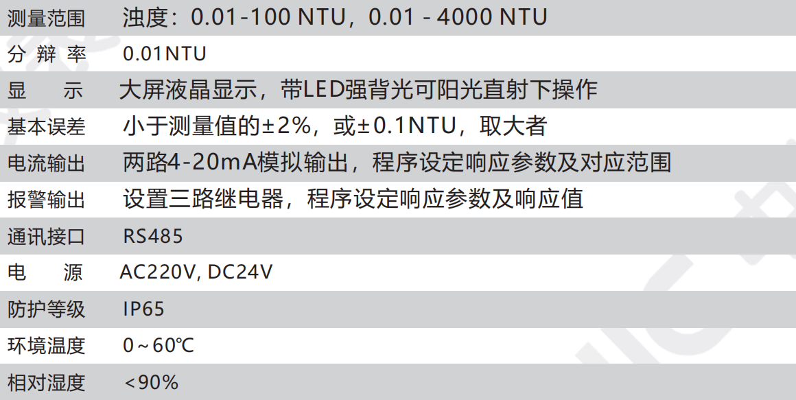CN142-A型在線濁度儀采用光電技術(shù)、維護率低、可靠性高;多參數(shù)同時顯示,濁度值、輸出電流、時間; 中文菜單和簡便的按鍵操作;4-20mA變送輸出、繼電器控制輸出、RS485通信輸出等各種變量輸出,系統(tǒng)智能控制;上下限報警繼電器輸出。