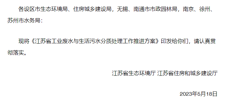 首頁 > 中核資訊 > 行業(yè)新聞行業(yè)新聞 > 資訊 | 《江蘇省工業(yè)廢水與生活污水分質(zhì)處理工作推進方案》發(fā)布!