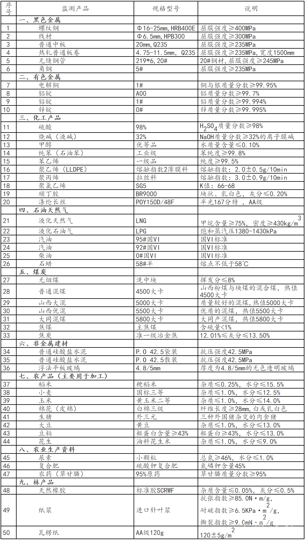 流通領域重要生產資料市場價格監測內容包括9大類50種產品的價格。類別與產品規格說明詳見附表。