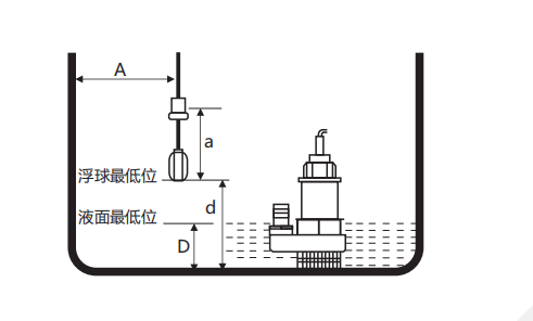 浮球動作長度“a”必須小于槽壁與電纜之間距離“A”否則容易造成動作不正確。浮球控制之最低水位“d”必須大于泵的最低水位“D”,以保護馬達。