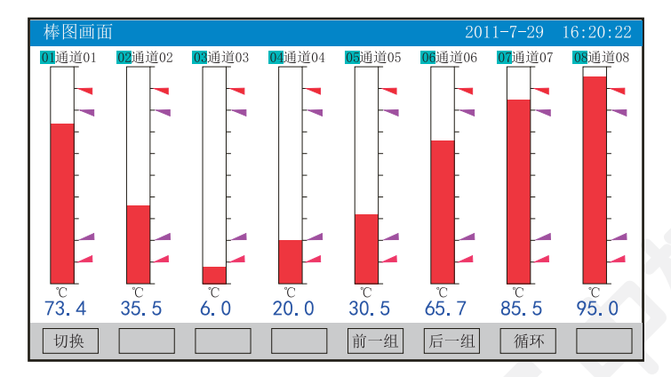 5、棒圖畫面:以棒圖的形式顯示測量值,同時還可顯示通道位號、工程單位及報警狀態等信息。