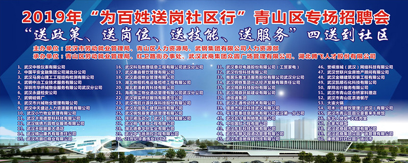 為了更好的解決青山區居民待崗就業問題,緩解居民生活壓力,武漢市勞動就業管理局,青山區人力資源局,武鋼集團有限公司人力資源部聯合多家知名大型企業將舉辦一場2019年“為百姓送崗社區行”青山區專場招聘會,為社區居民“送政策、送崗位、送技能、送服務”。
